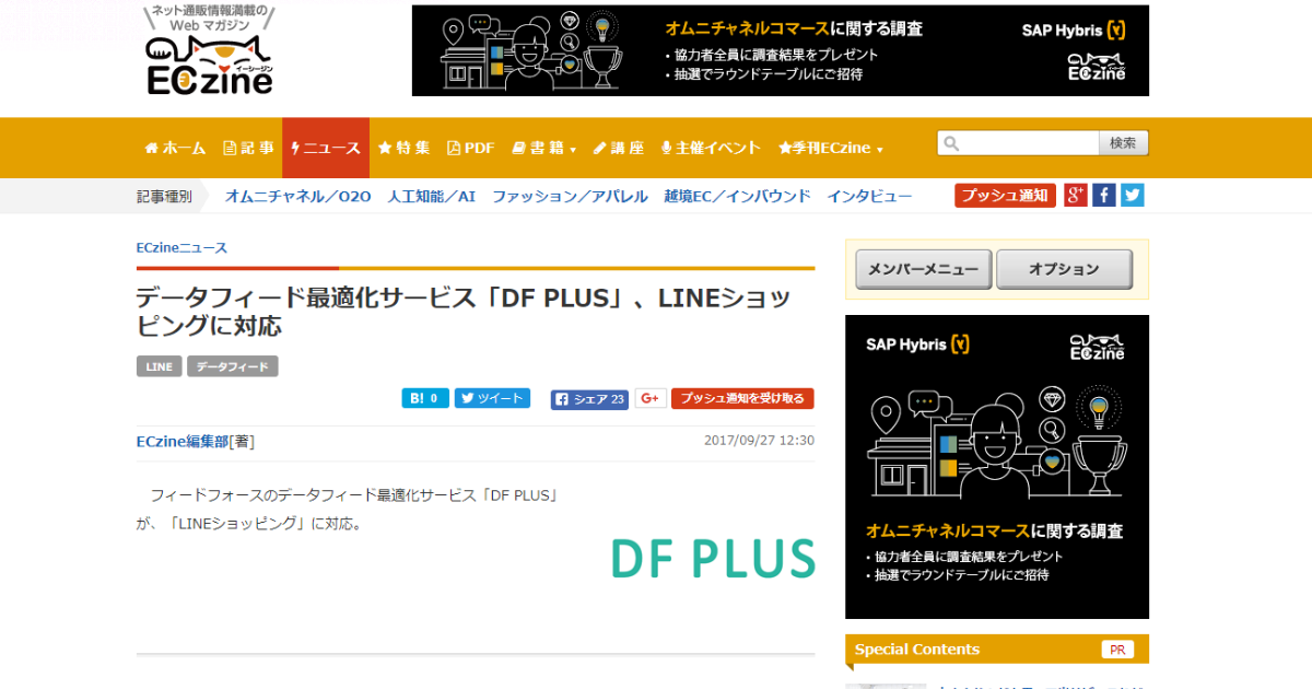 ネット通販情報に特化したWebマガジンを運営する『ECzine』にデータフィード最適化サービス「DF PLUS」とLINEのショッピングサービス「LINEショッピング」との連携開始に関する記事が掲載されました。