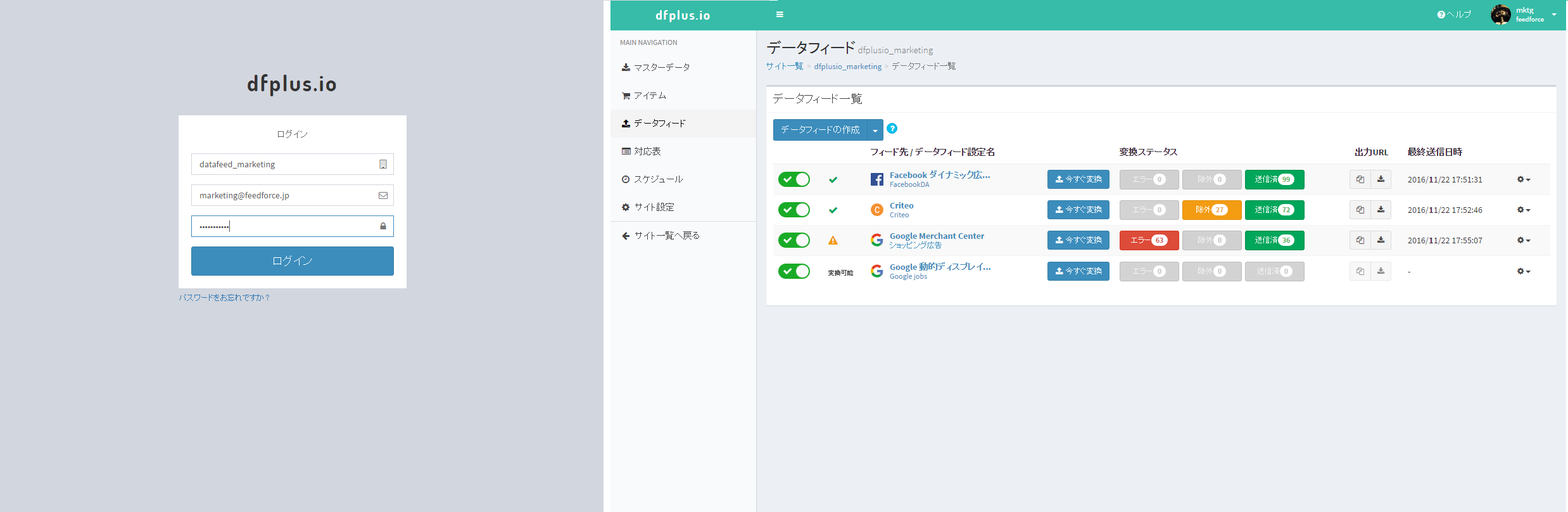 図 データフィード統合管理プラットフォームdfplus.io画面イメージ